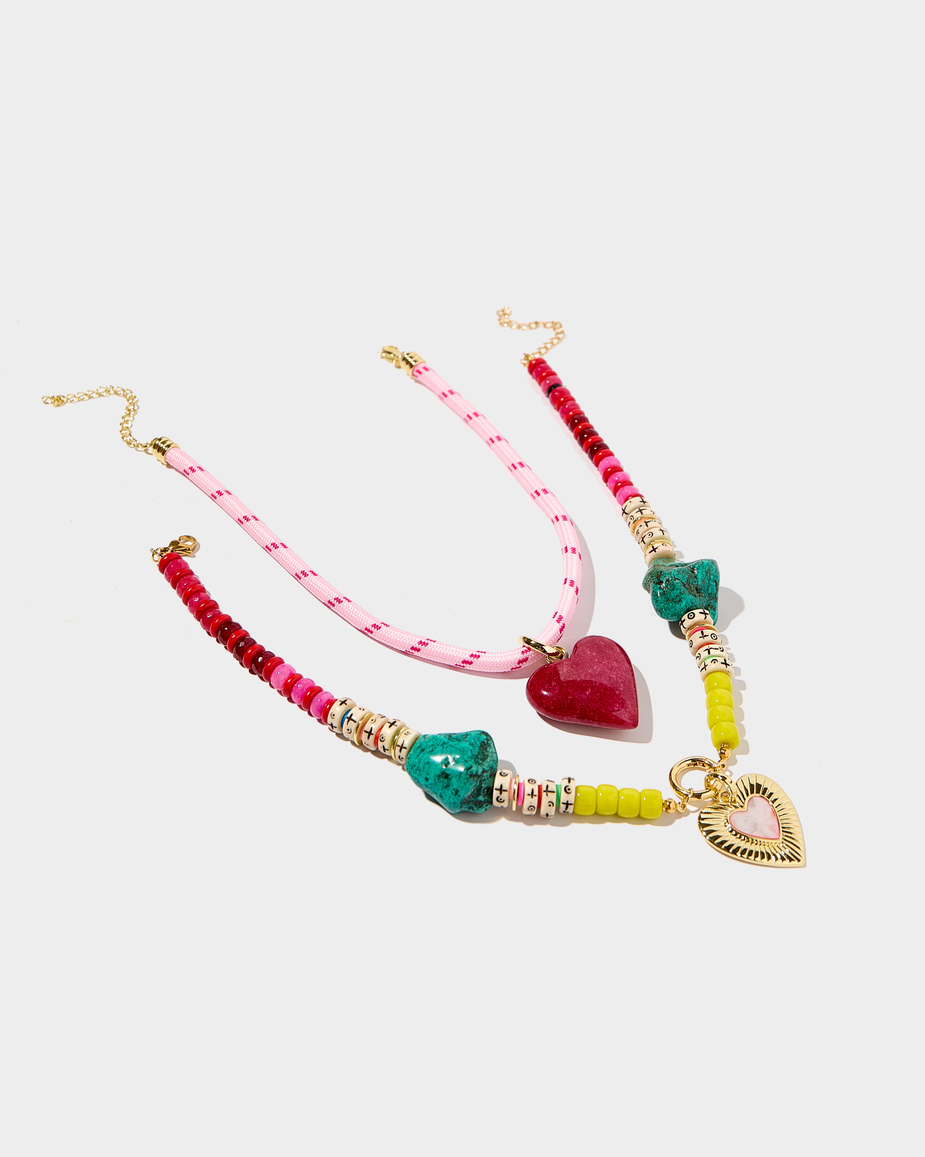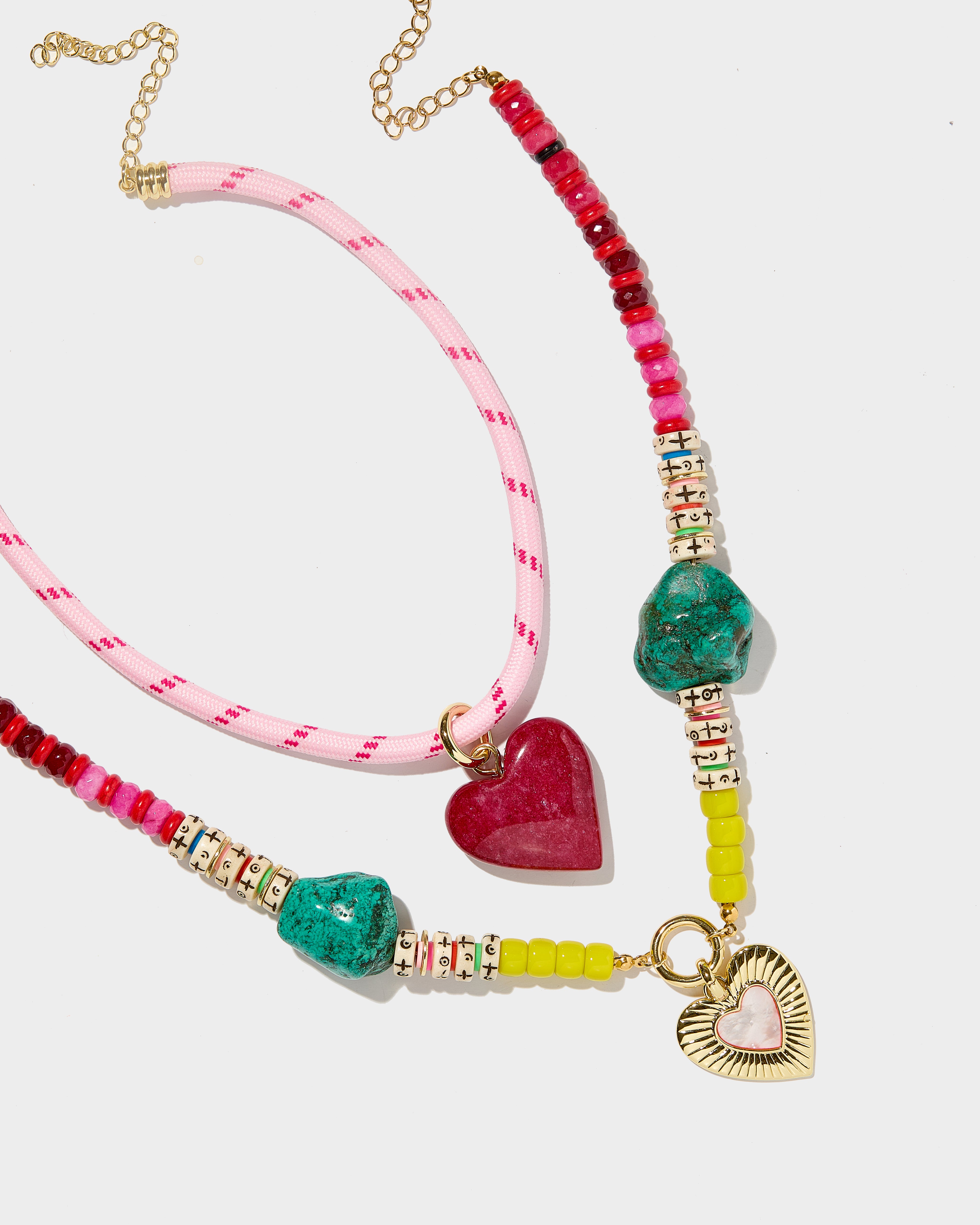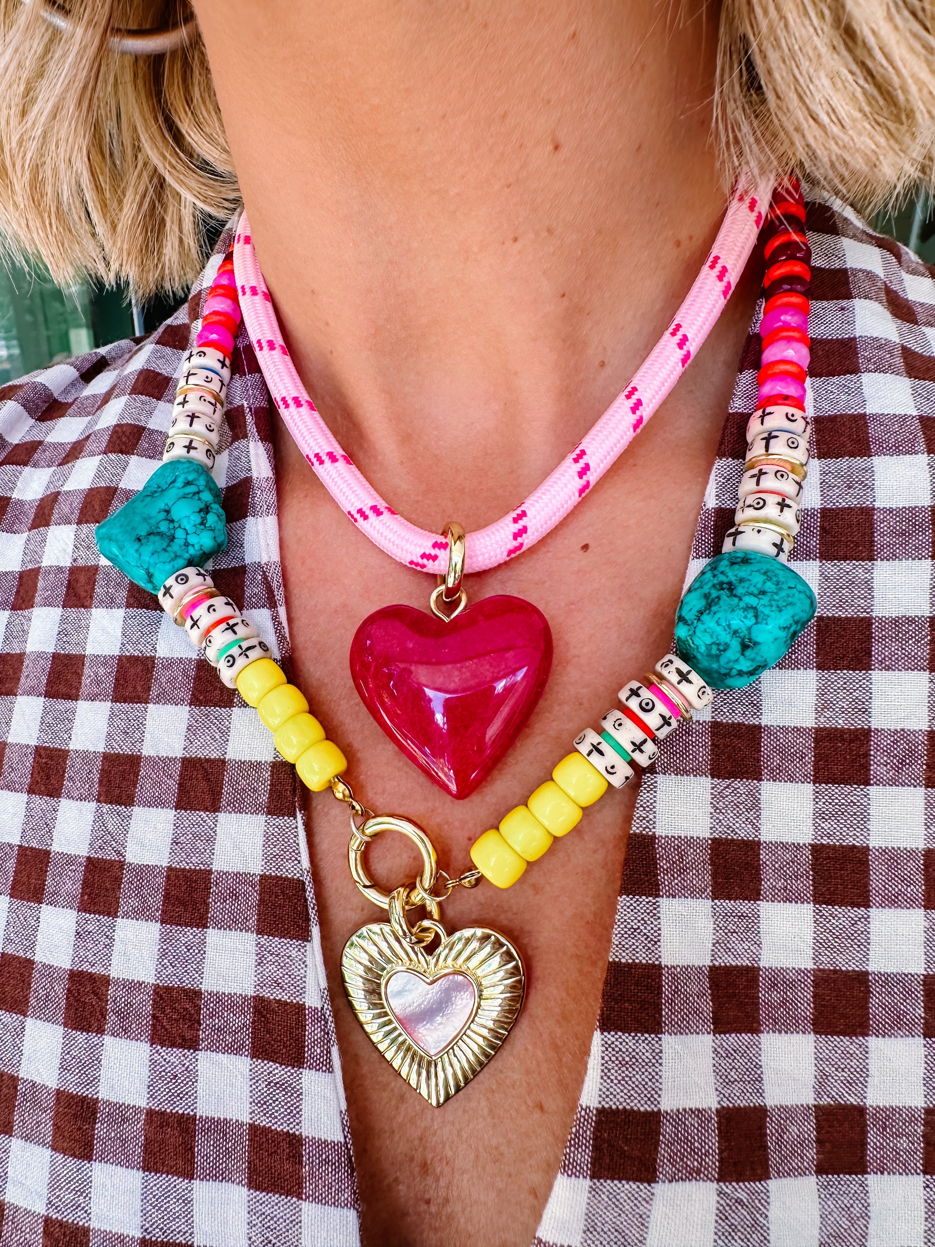 Shorter necklace length: Pink Cord Necklace in 14in, Bekah Necklace in 16in