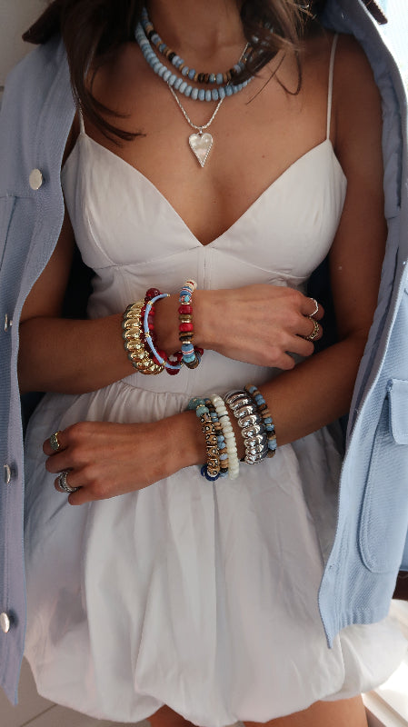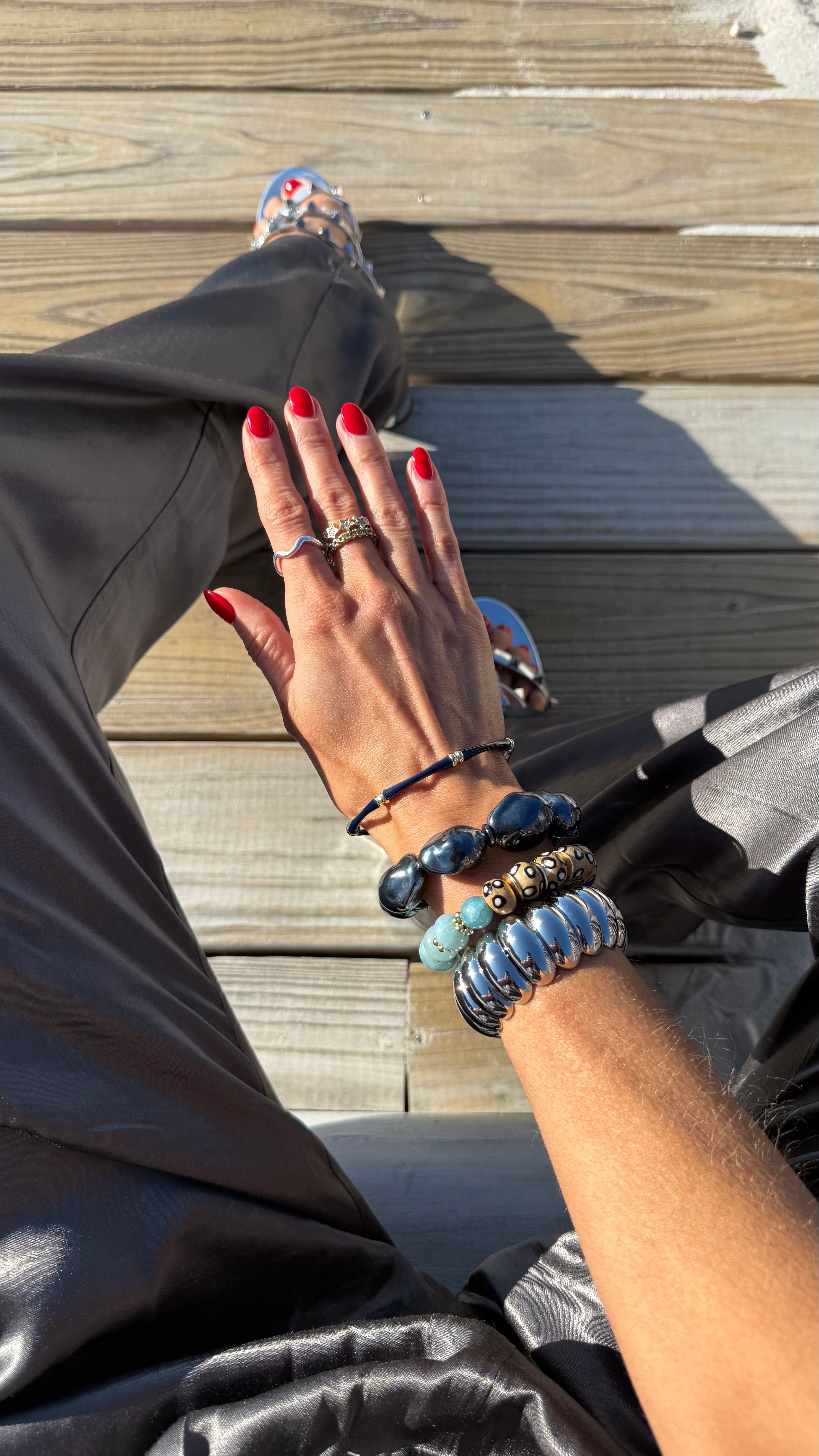 In their first bracelets, A+B included 5 black vinyl beads as a symbol of their 5 kids. Today, it's evolved into a black element or bead in every piece. Not only does it make their jewelry easy to spot, but also serves as a constant reminder of their biggest why.