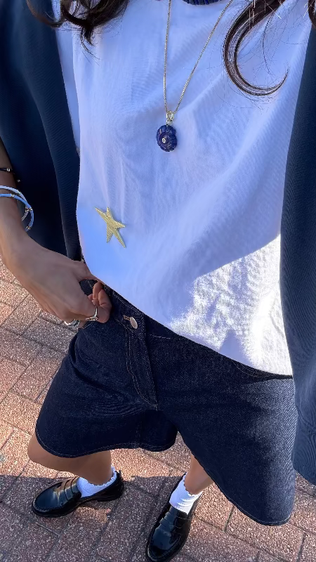 A palette of navy, crisp white, and washed blues anchors the collection. Colors that feel timeless and effortless. Easy to mix into what you already wear, easy to layer, easy to reach for again and again.
